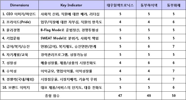 동부하이텍은 시스템반도체 파운드리업체이지만 급여, 성장성의 측면에서는 대우일렉트로닉스보다 좋은 평가를 받았지만 수익성이나 경쟁력은 약하다. 동부화재는 삼성화재, 현대해상에 이어 3위이지만, 자동차보험에서는 삼성화재에 이어 2위를 하고 있다. 급여, 수익성, 경쟁력, 브랜드 이미지 등의 차원에서 3개 회사 중 가장 좋은 평가를 받았다.