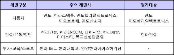 ▲ [표1. 한라의 주요 계열사와 평가대상]