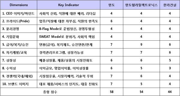 평가대상 기업 중 만도가 급여/복지/승진, 자기계발/교육, 경쟁력, 브랜드 이미지 등의 차원에서 높은 점수를 받아 가장 높은 점수를 받았다. 만도헬라일렉트로닉스는 급여가 만도보다 높지만 수익성, 경쟁력, 브랜드 이미지 등의 차원에서 낮은 평가를 받았다.