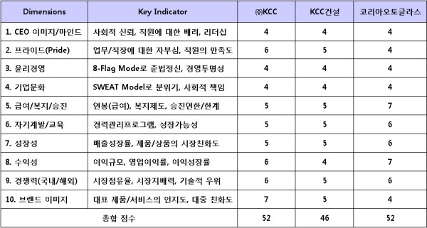 웅진그룹, 한화그룹 등 다른 그룹과 마찬가지로 태양광사업을 신수종사업으로 선택했고, 현대중공업 등 형제그룹까지 끌어들여 야심 차게 펼쳤지만 막대한 적자, 미래전망의 불투명성으로 어려움을 겪고 있다. KCC의 주요 계열사를 위대한 직장을 평가하는 10가지 차원(dimension)으로 평가해 보자.