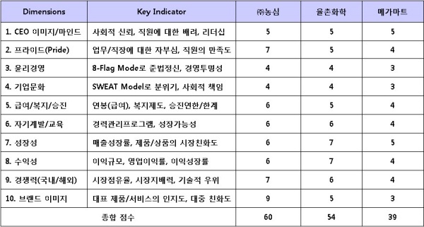 평가결과를 보면 ㈜농심은 급여, 자기계발, 경쟁력, 브랜드 이미지 차원(dimension)을 중시하는 구직자에게 유리하고, 율촌화학은 성장성, 수익성을 우선적으로 고려하는 구직자가 관심을 가질 만 하다.