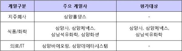 ▲ [표1. 삼양의 주요 계열사와 평가대상]