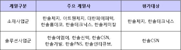 ▲ [표1. 한솔의 주요 계열사와 평가대상]