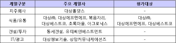 ▲ [표1. 대상의 주요 계열사와 평가대상]