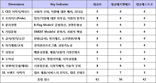 지주회사부문 계열사는 대상홀딩스이다. 대상홀딩스는 대상㈜의 투자부문을 인적 분할하여 2005년 설립한 순수지주회사다. 직원의 규모나 매출이 아주 미미하고, 실질적인 지주회사의 역할만 하고 있어 평가대상으로는 부적절해서 제외했다.