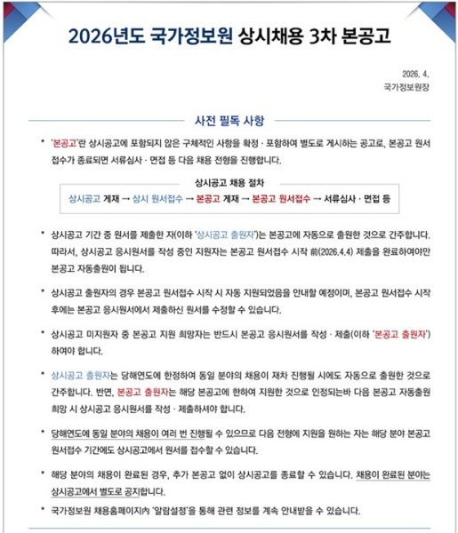 ▲ 2026년도 국가정보원 경력직 상시채용 3차 본공고 [출처=국가정보원]