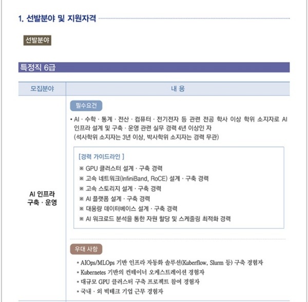 선발분야(특정직 6급)는 AI 인프라 구축·운영, 빅데이터 플랫폼 구축, 빅데이터 분석 및 지식그래프 구축, MLOps개발, AI 미래 기술 등