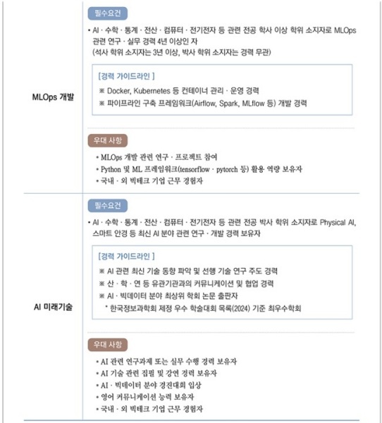 • AI·수학·통계·전산·컴퓨터·전기전자 등 관련 전공 학사 이상 학위 소지자로 MLOps 관련 연구·실무 경력 4년 이상인 자 (석사 학위 소지자는 3년 이상, 박사 학위 소지자는 경력 무관)