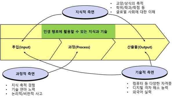 먼저 지식적 측면은 투입(input)과 산출에 모두 적용되며 교양·상식의 축적, 학위·학과·학점 등 학업 관련 이력, 글로벌 사회에 대한 이해가 포함된다. 교양과 상식은 공식적인 학교 교육에서도 얻을 수 있지만 가정이나 사회생활을 통해 축적하는 것도 가능하다,