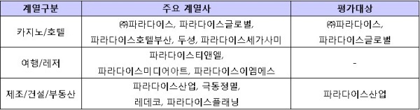 ▲ [표1. 파라다이스의 주요 계열사와 평가대상]