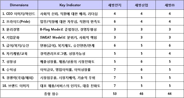 세방의 모기업은 종합물류기업인 세방㈜이지만, 축전지 관련 사업을 하고 있는 세방전지와 세방산업이 더 우량하고 인지도가 높은 기업으로 평가됐다. 업종은 다르지만 계열사의 급여체계와 복지제도 등은 유사한 것으로 보이며, 업무의 전문성이 높지 않아 자기계발 가능성은 모두 낮았다.