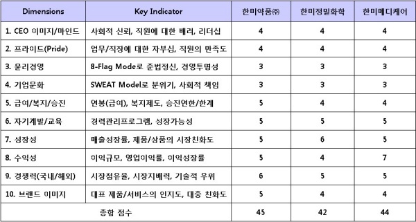 평가대상 기업 중에서 한미약품㈜가 급여나 경쟁력, 브랜드 이미지 등의 차원에서 상대적으로 높은 점수를 획득해 가장 우량한 기업으로 평가됐다. 다음으로 한미메디케어는 계열사 중에서 수익성 측면에서는 가장 뛰어났다.