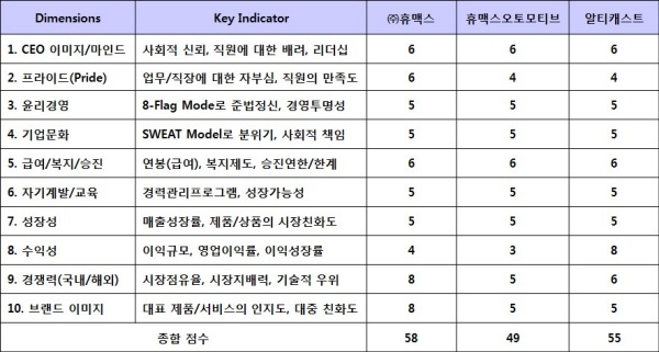 평가대상 기업 모두 급여가 중견 제조업체로서는 높은 수준을 유지하고 있는데, 우수인재를 채용하기 위한 전략으로 판단된다. 성장성과 수익성 부문에서 좋은 평가를 받지는 못했지만 전체적으로 국내 대기업의 계열사보다 높은 점수를 얻었다.