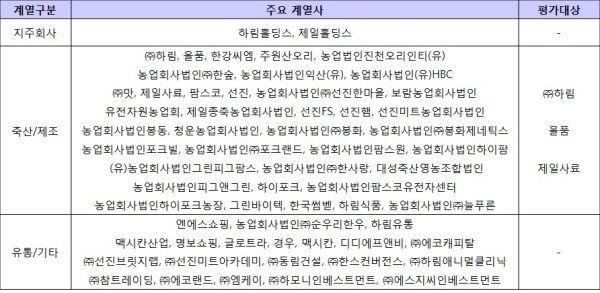 ▲ [표1. 하림의 주요 계열사와 평가대상]