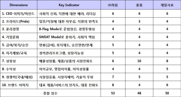 올품의 경우 성장성은 뛰어났지만 급여, 자기계발/교육, 경쟁력, 브랜드 이미지 등의 차원에서는 낮은 평가를 받아 계열사 중 가장 저조한 성적을 기록했다. 제일사료는 올품과 마찬가지로 성장성 차원이 가장 점수가 높지만 다른 차원은 비교적 보통 수준을 기록했다.
