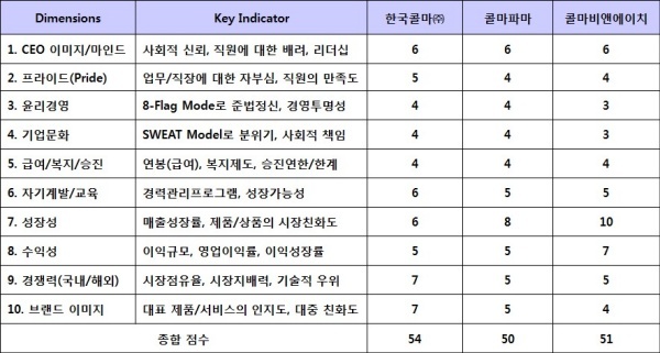 계열사 중 한국콜마㈜가 경쟁력이나 브랜드 이미지 차원에서 높은 점수를 획득해 가장 좋은 직장으로 꼽혔다. 콜마파마의 경우 성장성은 뛰어나지만 자기계발, 경쟁력, 브랜드 이미지에서는 낮은 평가를 받았다.
