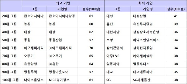동원그룹의 동원산업이 58점으로 최고, 보광그룹의 휘빅스벤딩서비스가 34점으로 최저점을 기록했다. 동원그룹은 참치 원양어업으로 성장해 식품, 음료로 사업을 확장하고 있는 중견그룹이다.