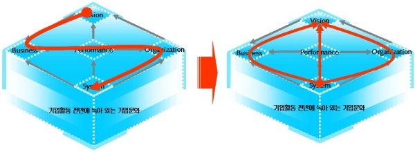 기업이 전체적으로 기업문화를 혁신하고자 하면 비전설정부터 사업정돈, 성과관리, 조직운영, 시스템 구축까지 전과정을 재검토하고 정립해야 한다.