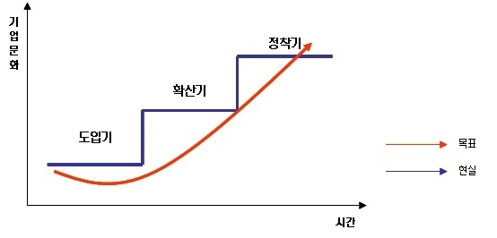 기업문화는 혁신의 노력과 시간이 지남에 따라 점증적으로 진화하는 것이 아니라, 계단식으로 단계적 상승을 하게 된다. 이런 점 때문에 기업문화 혁신이 매우 어렵다.