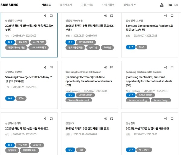 삼성(회장 이재용)에 따르면 2025년 8월27일(수)부터 우수 인재를 확보하고 청년들에게 양질의 취업 기회를 제공하기 위해 2025년 하반기 공채를 실시할 계획이다.