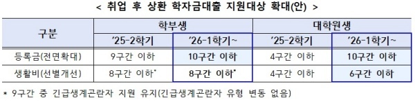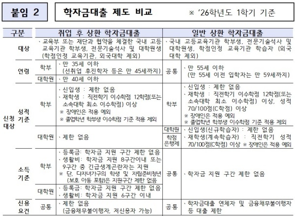 교육부는 재학 중 상환 부담없이 학업에 전념할 수 있도록 2026학년도부터 취업 후 상환 학자금대출 지원 대상을 대폭 확대한다. 취업 후 상환 대출 중 등록금 대출은 소득요건 제한을 폐지해 모든 대학생과 대학원생이 취업 후 상환 학자금 등록금 대출을 신청할 수 있다.
