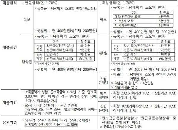 등록금 대출은 2025년도와 동일하게 소요액 전액이 가능하며 생활비는 200만 원까지 대출이 가능하다. 단, 대출제도 및 학제에 따라 개인 총 한도가 있다.