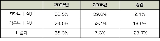 표를 보면 전담부서를 설치하는 기업은 소폭 증가한 반면 겸무부서를 설치한 기업은 대폭 증가했다.
