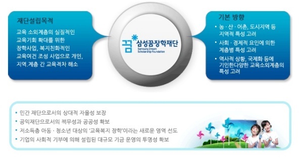 ▲삼성이 8000억원을 출연해 설립한 ‘삼성꿈장학재단 설립목적(출처 : 재단 홈페이지)