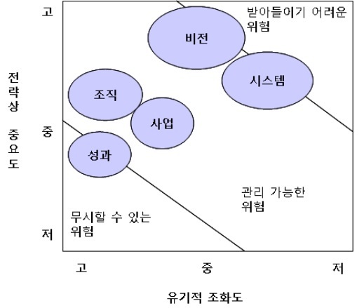 기업문화 위험의 관리는 개별 DNA의 유기적인 조화도, 기업경영전략상의 중요도에 따라 표시할 수 있다. [그림 2-2]에서 원의 크기는 기업이 개선의 필요성을 느껴야 하는 체감도를 의미한다.