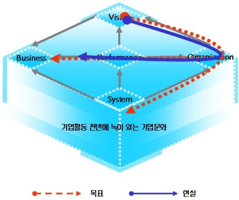 [그림 2-1]과 같이 CJ의 기업문화를 SWEAT Model의 5-DNA 10-Element의 관점에서 보면 사업(business), 성과(performance), 조직(organization) 부문에서는 중간 점수를, 비전(vision)과 시스템(system) 부문에서는 낮은 점수를 받았다.