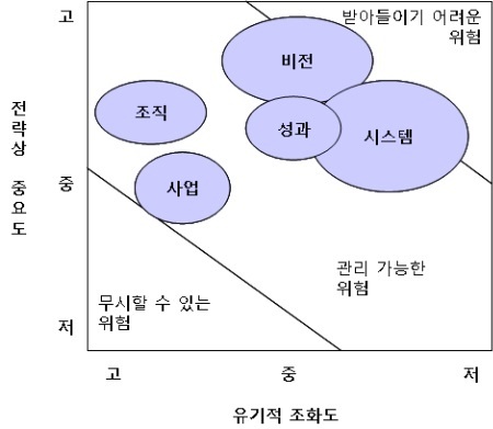 비전과 시스템의 일부는 받아들이기 어려운 위험에 속해 시급하게 해소해야 한다. 기업의 목표가 불명확해 비전을 재설정할 필요성이 높다. 성과를 높이기 위해 위험을 관리해야 하지만 조직차원에서 체계적으로 접근하지 못하고 있는 것으로 보인다.