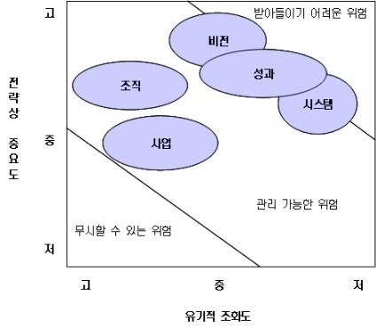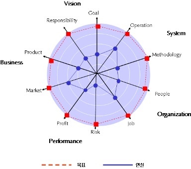 효성처럼 기본적으로 성장기를 넘어선 기업들은 조직과 사업의 유기적 조화도는 중상의 수준을 유지한다. 반면 비전, 성과, 시스템은 조화도가 낮을 뿐만 아니라 일부는 받아들이기 어려운 위험군에 속한다.