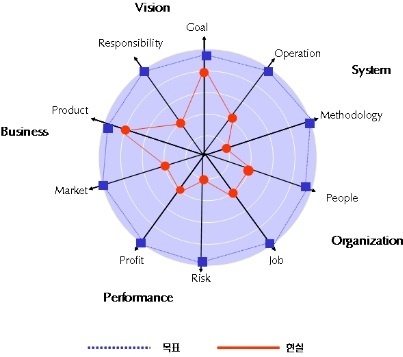 5-DNA 중 시스템의 유기적인 조화도가 가장 낮았다. 시스템을 도입할 때 조직의 약점을 보완하고 역량을 극대화할 수 있어야 한다. 비전은 유기적이니 조화도는 높았지만 전략상 중요도는 중간이다.