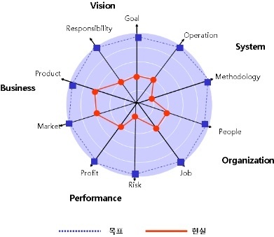 두산이 기업문화 5-DNA를 인식하고 관리하는 수준을 평가해 정리한 것이 [그림 13-2]다. 5-DNA 10-Element를 평가한 결과를 반영하면 두산은 사업, 비전에 대한 고민은 크게 하지 않아도 되지만, 성과, 조직, 시스템에 대한 위험은 시급하게 관리해야 할 것으로 보인다.