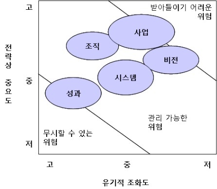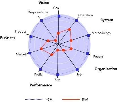 현대중공업이 기업문화 5-DNA를 인식하고 관리하는 수준을 평가해 정리한 것이 [그림 14-2]다. 5-DNA 10-Element를 평가한 결과를 반영하면 조직과 시스템은 관리 가능한 위험영역에 속하고 있지만 사업과 비전의 일부가 받아들이기 어려운 위험요소를 내포하고 있다.