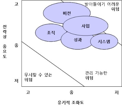 비전은 받아들이기 어려운 위험에 속한 부문이 가장 크다. 비전과 사업은 전략적으로 매우 중요함에도 불구하고, 제대로 관리하지 못하고 있는 것으로 보인다.