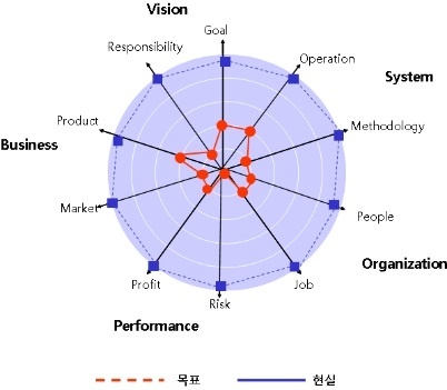 한라가 기업문화 5-DNA를 인식하고 관리하는 수준을 평가해 정리한 것이 [그림 21-2]다. 5-DNA 10-Element를 평가한 결과를 반영하면 비전, 성과, 조직 등 5개의 DNA 중 3개가 받아들이기 어려운 위험 영역에 속하고, 무시할 수 있는 위험영역에는 하나도 없다.