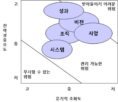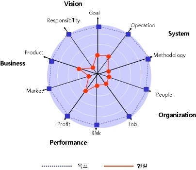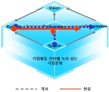 국내 10대 대기업이 최소한 1개 이상의 DNA를 무시할 수 있는 위험군에 속하도록 관리하고 있는 것과는 차이가 크다. 전략적으로 중요도가 높은 성과, 비전, 사업, 조직도 기업차원에서 고민해야 할 내용이 많은 편이다. 유기적 조화도를 봐도 5가지 DNA 모두 중간 이하에 위치하고 있다.