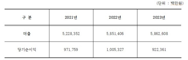 "2021년 5조2283억 원 규모였던 매출액이 2022년 3조8514억, 2023년 5조8626억 원 등으로 상승세를 유지하고 있다. 또한 당기순이익도 2011년 9700억 원대에서 2022년 1조 원을 넘었다가 2023년 9200억 원대로 감소했다."