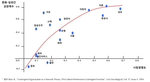 미국의 사회학자인 로날드 버트(Ronald Stuart Burt)는 시장경쟁도와 기업문화–성과 간 상관관계를 연구했으며 그 결과는 위의 그림과 같다. 시장경쟁도 지수는 시장집중도와 구매자 파워를 이용해 산출됐다.