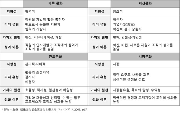 다른 하나는 조직이 내향적이어서 통합과 단결을 중시하는지, 외향적이어서 차별화와 경쟁을 중시하는지를 지표로 삼는다. 이 지표를 매트릭스로 구성하면 아래 표와 같이 관료문화, 시장문화, 가족문화, 혁신문화로 나눌 수 있다.