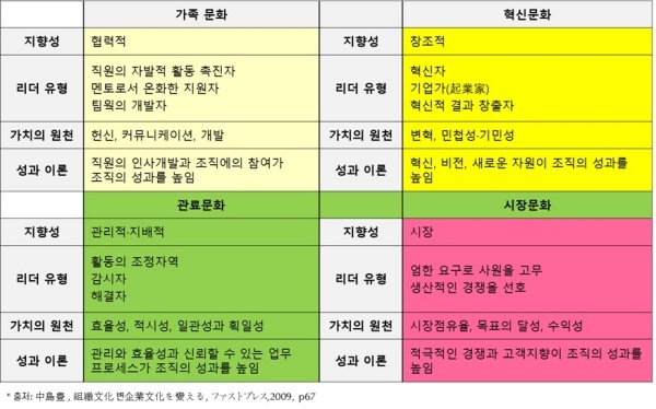 미국의 캐머런(Kim S. Cameron)과 퀸(Robert Quinn)은 기업문화를 관료문화, 시장문화, 가족문화, 혁신문화로 분류했고 각 문화에 따른 추진 전략을 아래 표와 같이 제시했다.