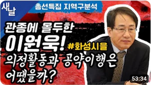 10월 10일(화요일) 새날 유튜브 방송에서는 2020년 21대 국회의원 선거에서 당선된 경기도 화성시을 이원욱 의원이 제시한 선거공약을 평가했다.