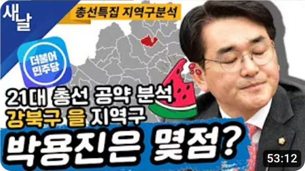 10월 17일(화요일) 새날 유튜브 방송에서는 2020년 21대 국회의원 선거에서 당선된 서울시 강북구을 박용진 의원이 제시한 선거공약을 평가했다.