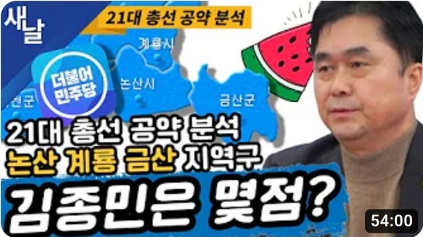 11월7일(화요일) 새날 유튜브 방송은 2020년 21대 국회의원 선거에서 당선된 충청남도 논산시·계룡시·금산군 김종민 의원이 제시한 선거공약을 평가했다.