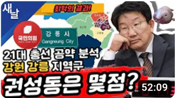 11월28일(화요일) 새날 유튜브 방송은 2020년 21대 국회의원 선거에서 당선된 강원특별자치도 강릉시 권성동 의원이 제시한 선거공약을 평가했다.