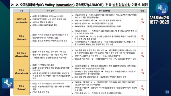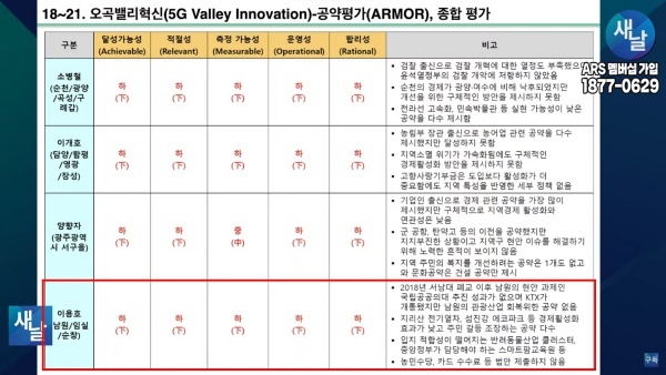 평가를 위한 방송에는 푸른나무, 이상구 원장, 민진규 소장(국가정보전략연구소) 등이 출연했다. 평가 방법은 국가정보전략연구소(국정연, iNIS)가 개발한 ‘오곡(五穀)밸리혁신(5G Valley Innovation)-선거공약’ 평가 모델을 적용했다.