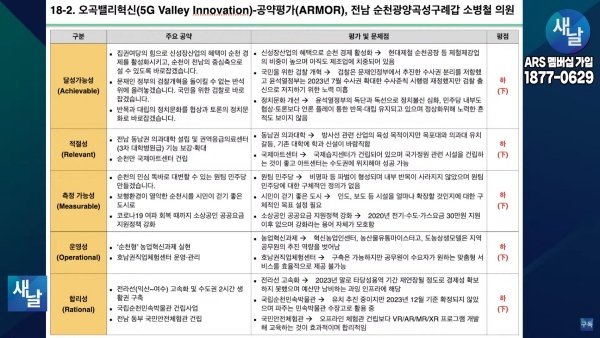 소병철 의원의 공약을 국정연이 개발한 갑옷(ARMOR), 즉 달성 가능성(Achievable)·적절성(Relevant)·측정 가능성(Measurable)·운영성(Operational)·합리성(Rational) 지표를 적용해 평가해보니 5개 분야 모두가 하(下)로 평가되었습니다.
