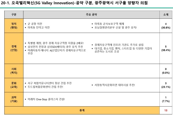 광주광역시 서구을 지역구의 양향자 의원은 기업인 출신으로 경제 관련 공약을 가장 많이 제시 했지만 구체적으로 지역경제 활성화와 연관성은 낮은 공약들이었습니다.