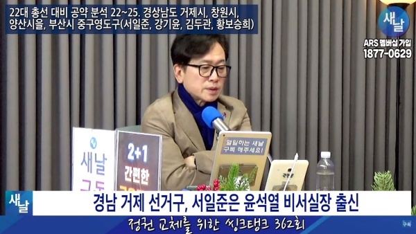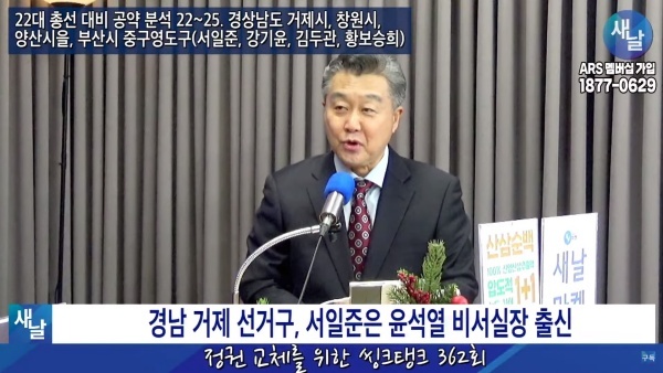 12월26일(화요일) 새날 유튜브 방송은 2020년 21대 국회의원 선거에서 당선된 경상남도 거제시 서일준 의원이 제시한 선거공약을 평가했다. 평가를 위한 방송에는 푸른나무, 이상구 원장, 민진규 소장(국가정보전략연구소) 등이 출연했다.